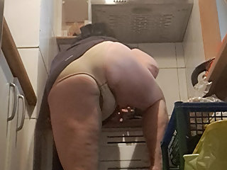 "in the kitchen, relaxed, supported on her back"